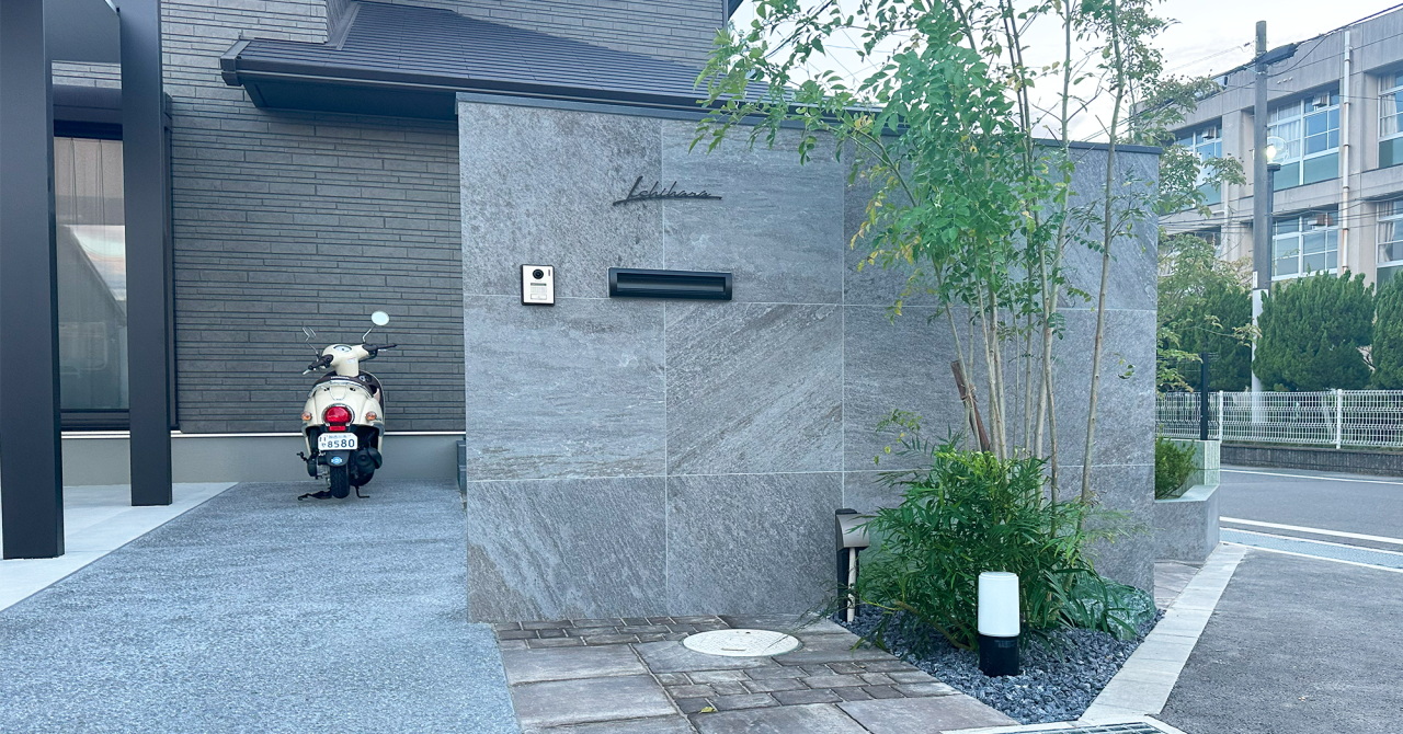 グレーの600角のタイル門柱になります。上に笠を置いており、筆記体の表札も相まって、落ち着いたクールな空間を演出しています。横には植栽を植えており、緑のアクセントがとてもきれいです!