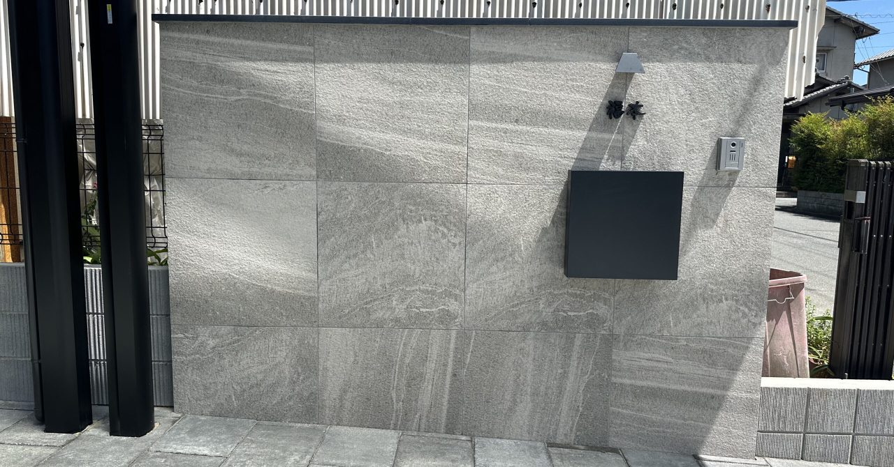 住友林業の平屋に合わせた600角のタイル門柱になります。タイルはラグジュアリーな高級感があり、住宅の良さ、価値を引き上げます。長年使い続けるからこそ、本物志向の素材を採用してみるのもオススメ!
