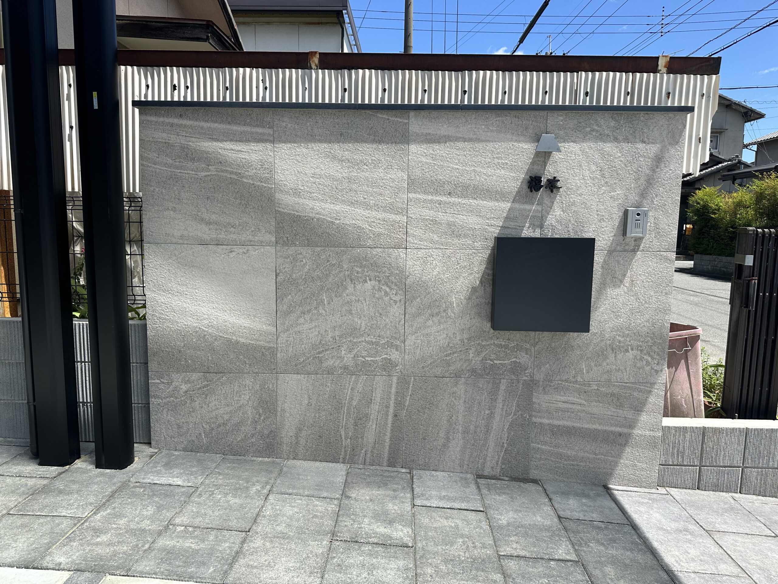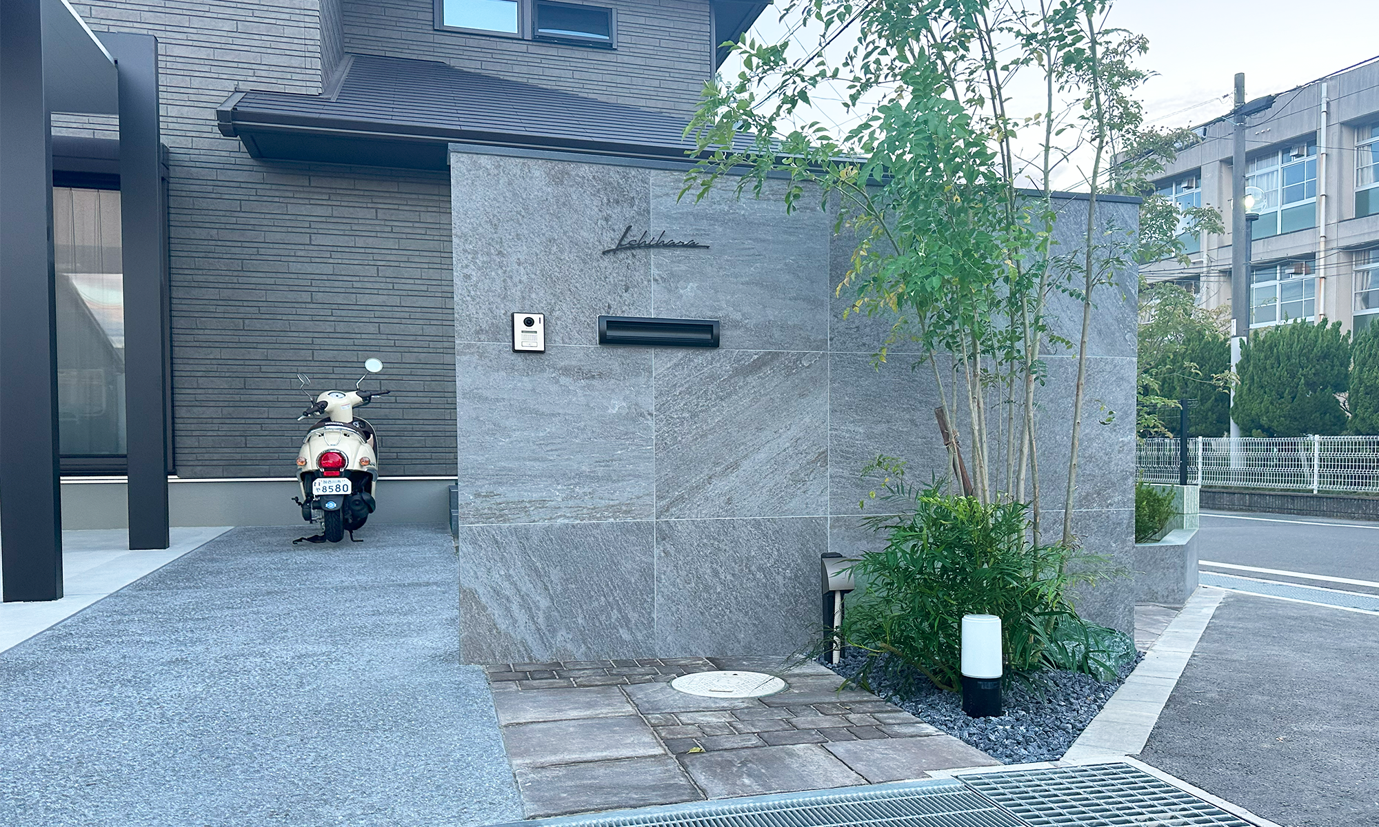 グレーの600角のタイル門柱になります。上に笠を置いており、筆記体の表札も相まって、落ち着いたクールな空間を演出しています。横には植栽を植えており、緑のアクセントがとてもきれいです!